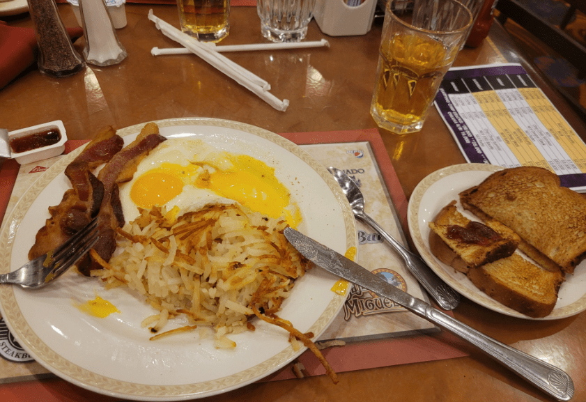 Där åt vi en frukost, klassiskt ägg och bacon och lite annat.